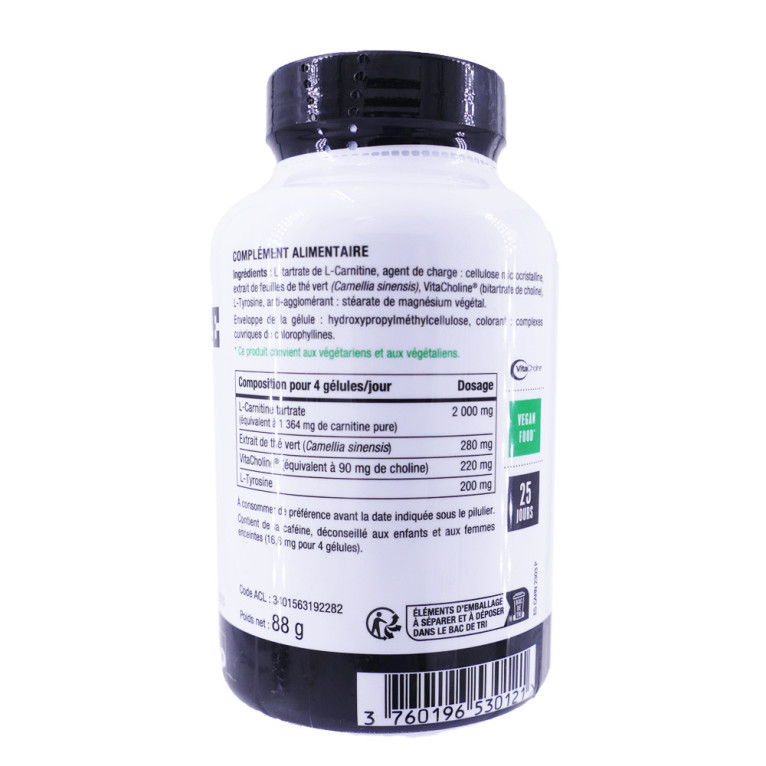 L-tartrate de L-Carnitine, agent de charge : cellulose microcristalline, extrait de feuilles de thé vert (Camellia sinensis), VitaCholine® (bitartrate de choline), L-Tyrosine, anti-agglomérant : stéarate de magnésium végétal. Gélule végétale : hydroxypropylméthylcellulose, colorant : complexes cuivriques de chlorophyllines.