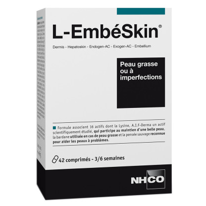 Ces 42 comprimés sont spécialement conçus pour vous offrir une peau éclatante et revitalisée. Grâce à sa formule unique, ce complément alimentaire agit de l'intérieur pour améliorer la qualité de votre peau. Les principaux composants de L-EMBESKIN sont soigneusement sélectionnés pour leurs résultats sur la peau. Parmi ces composants l'A.I.F-Derma est un ingrédient dont l'efficacité sur la beauté de la peau a été scientifiquement prouvée. Il contient une quantité importante d'acides aminés. Le zinc associé aux votamines B contribuent au maintien d'une peau normale. Grâce à sa prise quotidienne, vous constaterez rapidement une amélioration de la texture et de la luminosité de votre peau.
