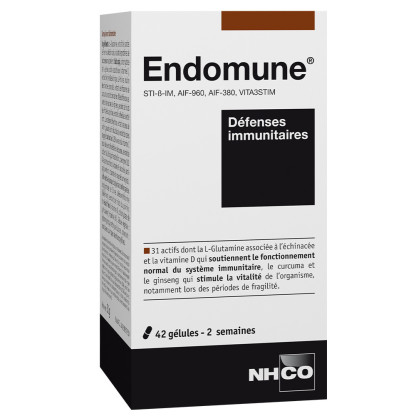 ENDOMUNE Défenses Immunitaires laboratoire NHCO Nutrition, 31 composants réunis dans des gélules dans votre parapharmacie en ligne dont les vitamines C et D et le Zinc qui contribuent au bon fonctionnement du système immunitaire.