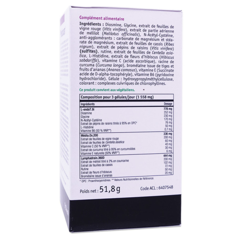 Le complexe L-endoT.9i, avec ses acides aminés glycine et L-histidine, la N-acétyl-cystéine, la diosmine et l'extrait de pépins de raisins : l'extrait de pépins de raisins soutient le confort circulatoire et le maintien des vaisseaux sanguins sains et l'intégrité capillaire. Le complexe Média.0x.200 est enrichi en vitamines C et E, ainsi qu'en curcuma, Centella asiatica et feuille de vigne rouge : les vitamines C et E participent à la protection des cellules contre le stress oxydatif, la vitamine C contribue à la formation normale de collagène afin d'assurer le fonctionnement normal des vaisseaux sanguins. Enfin, le complexe Lymphadrain.360D, contenant de la bromélaïne, du mélilot, de l'hibiscus et de la feuille de cassis : le mélilot contribue à la sensation de jambes légères tandis que la feuille de cassis contribue à faciliter l'élimination rénale de l'eau.