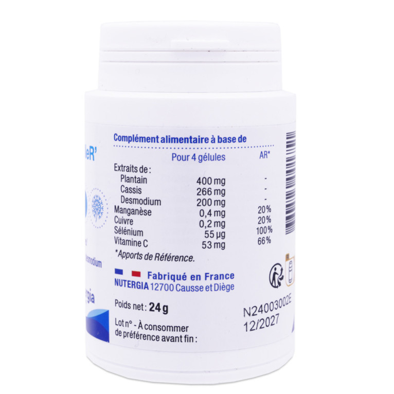 Ce complément alimentaire du laboratoire NUTERGIA est formulé à partir d'ingrédients soigneusement sélectionnés pour leur contribution au confort respiratoire lors de gênes saisonnières comme le pollen, et également les acariens ou les poils d'animaux. La vitamine C et le cuivre participent au fonctionnement normal du système immunitaire, tandis que le plantain a un effet apaisant sur la bouche, la gorge, et le pharynx. Le manganèse et le sélénium contribuent à la protection des cellules contre le stress oxydatif. Le desmodium et le cassis complètent la formule. Ensemble, ces ingrédients offrent un soutien complémentaire pour les périodes saisonnières.