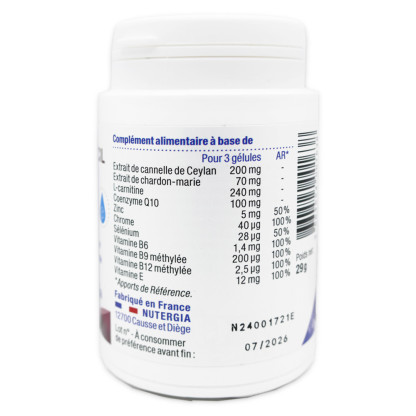 Pour 3 gélules: Extrait de cannelle de Ceylan 200 mg ; Extrait de chardon-marie 70 mg ; L-carnitine 240 mg ; Coenzyme Q10 100 mg ; Zinc 5 mg 50 % ; Chrome 40 µg 100 % ; Sélénium 28 µg 50 % ; Vitamine B6 1,4 mg 100 % ; Vitamine B9 méthylée 200 µg 100 % ; Vitamine B12 méthylée 2,5 µg 100 % ; Vitamine E 12 mg 100 %. *Apports de Référence
