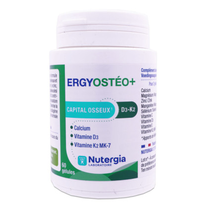 ERGYOSTÉO+ contient des vitamines et minéraux essentiels pour le maintien de l'ossature. La vitamine D3 qui s'associe au calcium favorise le maintien d'une ossature normale et participe au maintien d'une ossature normale. Le calcium est nécessaire au maintien d'une ossature normale. Le magnésium contribue à l'absorption du calcium et de la vitamine D3. Ce complément alimentaire contient également d'autres minéraux bénéfiques pour le corps.