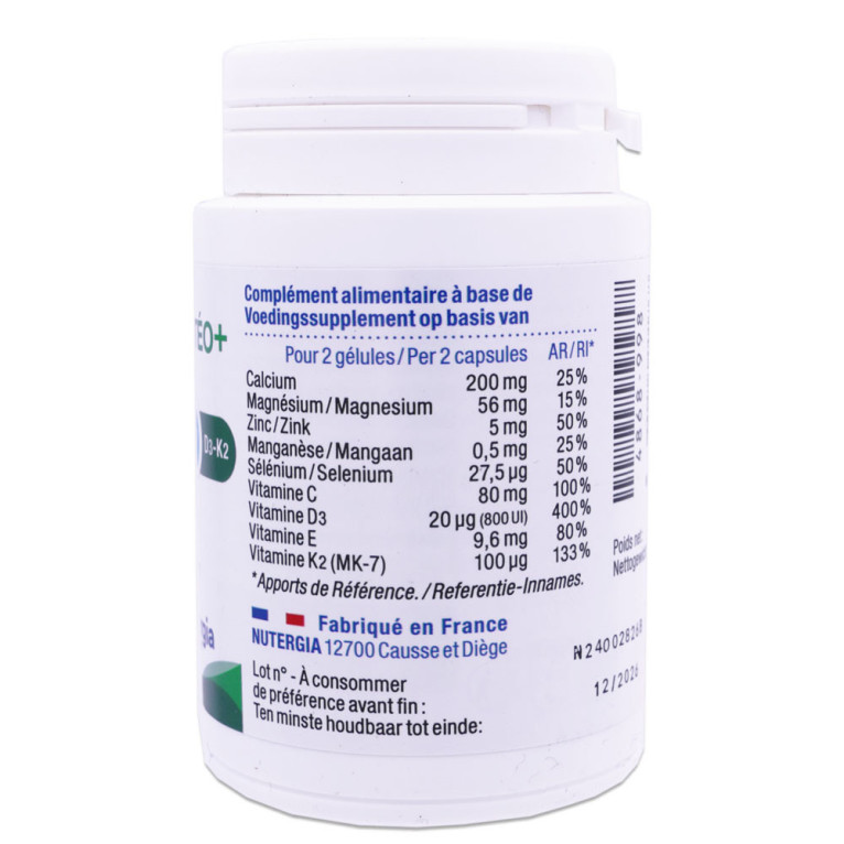 .Carbonate de calcium, vitamine C (L-ascorbate de calcium), oxyde de magnésium, agent de charge : mono et diglycérides d’acides gras ; vitamine K2 (ménaquinone MK-7), citrate de calcium, gluconate de zinc, antiagglomérant : sels de magnésium d’acides gras ; carbonate de magnésium, vitamine E (succinate acide de D-alpha-tocophéryle), vitamine D3 (cholécalciférol), sélénite de sodium, gluconate de manganèse. Gélule végétale (hydroxypropylméthylcellulose).