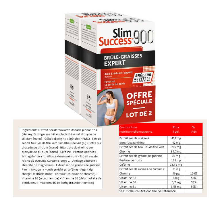 Slim Success 900 Brûle-Graisse Expert du laboratoire NUTREOV, est un complément alimentaire composé de curcuma, qui aide à réduire l’accumulation des graisses, et de wakamé, qui contribue à réduire l’appétit. Du guarana, vient s’ajouter à ce produit et participe à la perte de poids. La formule comprend également du chrome, des vitamines B1, B3, et B6, ainsi que de la caféine, de la choline et de la pectine de fruits. Prenez soin de votre silhouette avec Slim Success 900 Brûle-Graisse Expert lot de 2X120 gélules, un allié minceur naturel et efficace.