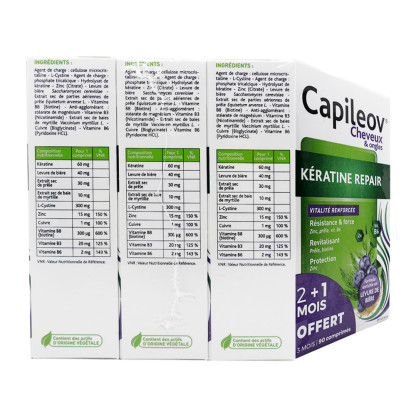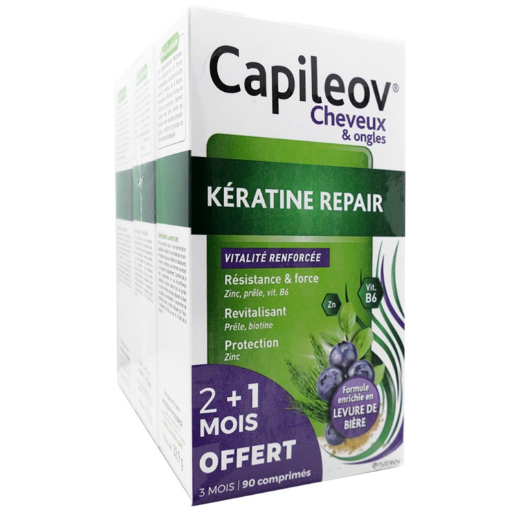 NUTREOV CAPILEOV KÉRATINE REPAIR CHEVEUX & ONGLES LOT DE 3X30 COMPRIMÉS : Offrez à vos cheveux et ongles force et beauté en vente en ligne, sur le site de votre parapharmacie à prix discount. Ce lot de comprimés est spécialement formulé pour vos cheveux et vos ongles fragilisés