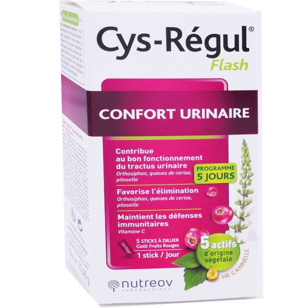 Cys-Régul Flash Confort Urinaire du laboratoire NUTREOV, est un complément alimentaire composé de piloselle, qui contribue à l’élimination rénale, et de queue de cerise, qui favorise le fonctionnement normal urinaire. De la vitamine C vient s’ajouter à ce produit et aide au maintien de bonnes défenses immunitaires.