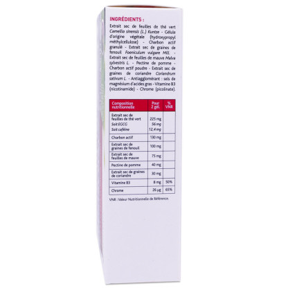 Ingrédients : Extrait sec de feuilles de thé vert Camellia sinensis (L.) Kuntze - Gélule d'origine végétale (hydroxypropyl méthylcellulose) - Charbon actif granulé - Extrait sec de graines de fenouil Foeniculum vulgare Mill. - Extrait sec de feuilles de mauve Malva sylvestris L. - Pectine de pomme - Charbon actif poudre - Extrait sec de graines de coriandre Coriandrum sativum L. - Antiagglomérant : stéarate de magnésium - Vitamine B3 (nicotinamide) - Chrome (picolinate).
