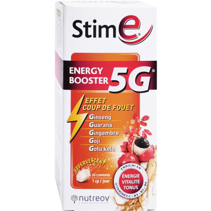 STIM E Energie Booster 5G de NUTREOV est un complément alimentaire sous forme de comprimés effervescents au goût orange, composé de 5 extraits de plantes et vitamines. Le Ginseng augmente l’endurance et maintien le bien-être physique ; le Gingembre maintient l’immunité et possède des propriétés antioxydantes ; le Guarana (source de caféine) améliore la vigilance et réduit la fatigue mentale ; les vitamines B et la vitamine C (apportée par un extrait d’acérola) aident à réduire la fatigue. La L-arginine qui est un acide aminé complète la formule afin de contribuer à la synthèse des protéines essentielles pour un bon fonctionnement de l’organisme