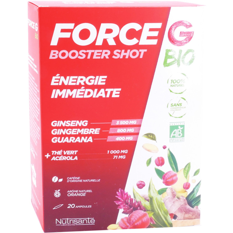 Force G Booster Shot de NUTRISANTE est un complément alimentaire sous forme d’ampoules buvables à la saveur orange, sans conservateur et sans colorant, composé de Ginseng bio qui aide en cas de fatigue, de stress et de convalescence, de Gingembre bio, de Guarana qui améliore la vigilance et réduit la fatigue mentale, il contribue également au maintien de la vitalité physique et mentale, de Thé Vert Bio et d'Acérola Bio contenant de la vitamine C qui favorise le maintien du système immunitaire et la réduction de la fatigue.