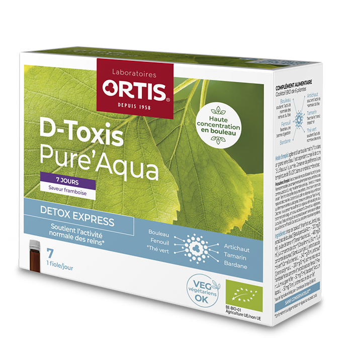 D-TOXIS PURE’AQUA à prix discount d’ORTIS, un complément alimentaire conditionné sous forme de fioles à boire pour un programme express de 7 jours, à base de plantes dont le thé vert qui soutient l’activité normale des reins, disponible dans votre parapharmacie en ligne à prix discount.