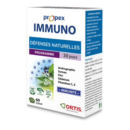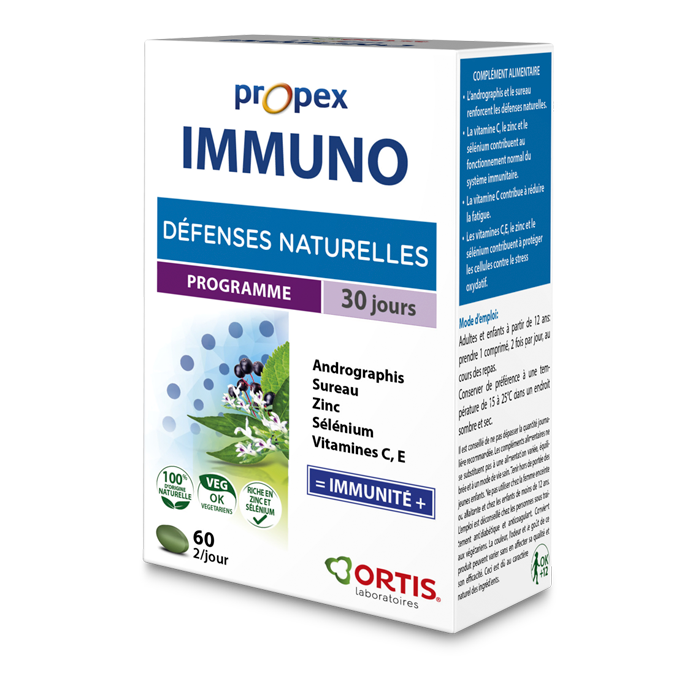 Le laboratoire Ortis, reconnu pour son expertise en phytothérapie, propose le complément alimentaire Propex Immuno, formulé à base d'andrographis et de sureau, des plantes qui renforcent les défenses naturelles de l'organisme. La vitamine C, le zinc et le sélénium contribuent au fonctionnement normal du système immunitaire. La vitamine C contribue également à réduire la fatigue. Les vitamines C et E, ainsi que le zinc et le sélénium, participent à la protection des cellules.