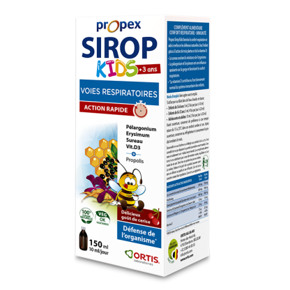 Ortis Propex Sirop Kids Voies Respiratoires 150ML est en vente en ligne sur le site de votre parapharmacie à prix discount. Ce sirop agit rapidement sur les voies respiratoires des enfants dès 3 ans grâce à sa formule naturelle.