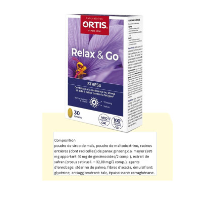 ORTIS RELAX & GO STRESS 30 COMPRIMÉS en vente en ligne, sur le site de votre parapharmacie à prix discount, est un complément alimentaire formulé à base de ginseng et de safran pour aider lors de stress et de fatigue.