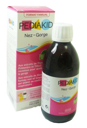 PEDIAKID Nez-Gorge est un complément alimentaire au goût citron/miel, composé d’extraits de plantes (Thym, Primevère, Tilleul, Mauve, Sureau noir, Gingembre) ainsi qu’à la vitamine C, au Zinc et au Cuivre. Le thym, la primevère et le tilleul ont un effet apaisant en cas d'irritations de la gorge et du pharynx . Le gingembre participe au confort respiratoire.