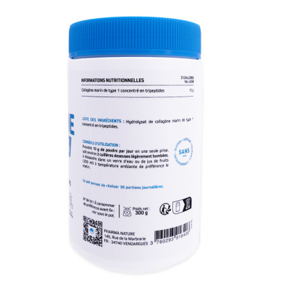 Ce produit contient du collagène marin de type 1 concentré en tripeptides, reconnu pour son rôle essentiel dans le soutien de la structure de la peau. Le collagène est une protéine ; celle-ci contribue au maintien de la fermeté et de l'élasticité de la peau, participant ainsi à la préservation de son aspect lisse et tonique mais également participent à l'augmentation de la masse musculaire et au maintien d'une ossature normale.