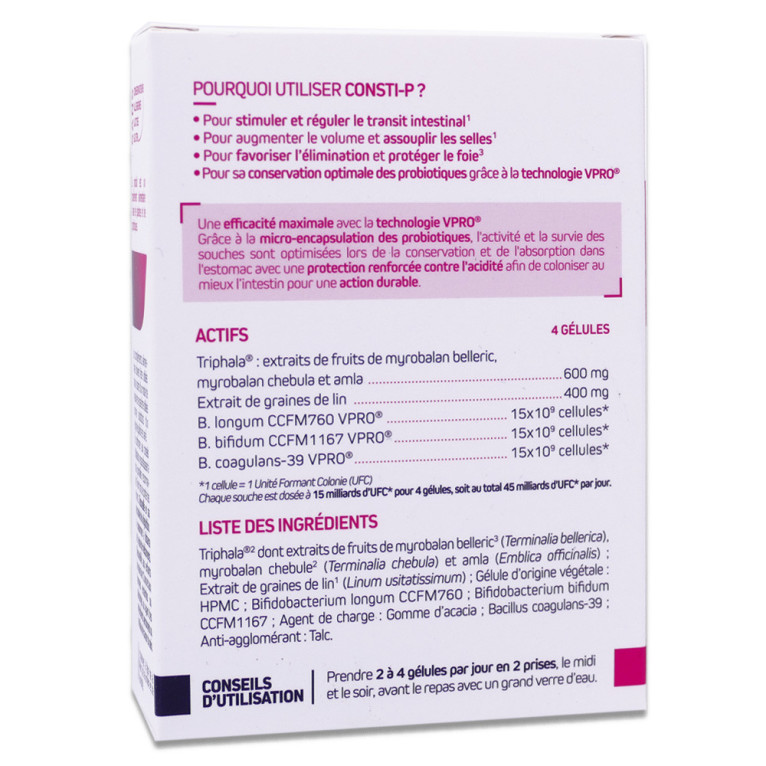 Le Triphala, composé d'extraits de myrobalan belleric, myrobalan chebule et amla, est reconnu pour soutenir la fonction digestive normale. Les graines de lin, riches en fibres, participent au bon fonctionnement du transit intestinal. Les probiotiques, développés grâce à la technologie VPRO, contribuent à maintenir l'équilibre de la flore intestinale. Ces ingrédients agissent en synergie pour contribuer au confort digestif quotidien.