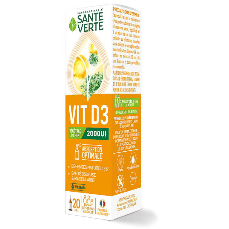 VITAMINE D3 2000 UI est un complément alimentaire sans colorant, qui procure à l’organisme l’apport nécessaire en vitamine D3 (1000% des apports de référence en vitamine D3). La vitamine D3 contribue au fonctionnement normal du système immunitaire, à une fonction musculaire et une ossature normale. Elle est particulièrement conseillée à l’entrée de l’hiver ou en période de croissance (enfant) ou de fragilité osseuse (ménopause…). La vitamine D3 contenue dans VITAL D3 est d’origine végétale issue du Lichen des Rennes. En format spray, il est pratique à utiliser. Sans colorant, sans conservateur et sans épaississant. Vegan