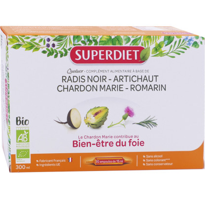 QUATUOR BIO DIGESTION de SUPERDIET, est un complément alimentaire à base de chardon marie, qui aide au fonctionnement normal du foie, et d'artichaut, qui contribue à l'élimination rénale. Du romarin et du jus de radis noir viennent s'ajouter à cette formule.