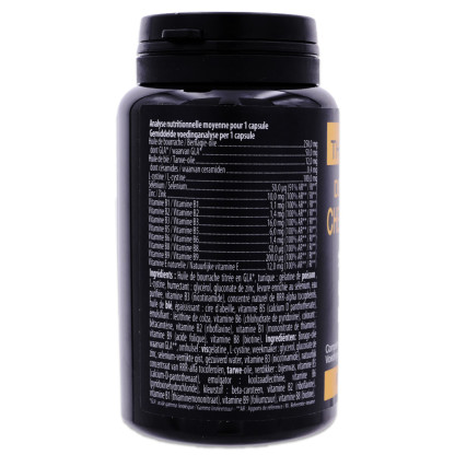 Il associe une synergie de deux huiles précieuses, l'huile de bourrache et l'huile de blé, ainsi qu'un acide aminé, la L-cystine. Ce produit contient également un complexe micronutritionnel incluant l'élénium Lynside® Forte Se, ainsi que des vitamines B2, B3, B5, B6, B8, B9 et de la vitamine E naturelle. Le sélénium et le zinc jouent un rôle clé dans le maintien de la beauté des ongles et des cheveux, tout en protégeant les cellules des dommages causés par le stress oxydatif. La vitamine B2 participe également à cette protection cellulaire. Les vitamines B3, B5 et B9 aident à diminuer la fatigue, qui peut parfois être à l'origine de la chute des cheveux. De son côté, la vitamine B6 favorise la synthèse normale de la cystéine, un élément essentiel de la kératine. La vitamine B8 est importante pour le maintien d'une chevelure saine, tandis que la vitamine E naturelle contribue elle aussi à la protection des cellules contre le stress oxydatif.
