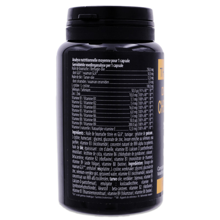 Huile de bourrache titrée en GLA*, tunique : gélatine de poisson, L-cystine, humectant : glycérol, gluconate de zinc, sélénométhionine, eau purifiée, vitamine B3 (nicotinamide), concentré naturel de RRR-α-tocophérols, huile de blé, épaississant : cire d'abeille, vitamine B5 (calcium D panthothenate), émulsifiant : lécithine de colza, vitamine B6 (chlohydrate de pyridoxine), colorant : β-carotène, vitamine B2 (riboflavine), vitamine B1 (mononitrate de thiamine), vitamine B9 (acide folique), vitamine B8 (biotine). *GLA : Acide γ-linolénique.