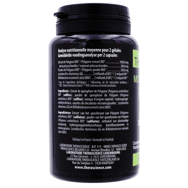 Le laboratoire THERASCIENCE est reconnu pour son engagement envers des formulations de qualité. Ce complément alimentaire contient du Polypore BIO, un champignon en ombelle, dont la poudre et l'extrait sont titrés à 30% en polysaccharides. De plus, la formule intègre deux souches de probiotiques microencapsulées individuellement (Probio-Protect®), qui soutiennent l'équilibre de la flore intestinale. Les gélules sont gastro-résistantes et 100% végétales, garantissant ainsi une libération optimale des actifs.