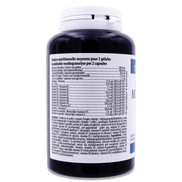 Extrait sec de pollen, tunique d'origine végétale : hydroxypropylméthylcellulose, extrait de racine de ginseng titré en ginsénosides, vitamine C (acide L-ascorbique), bisglycinate de zinc, levure de sélénium, vitamine E naturelle (acétate de D-alpha-tocophéryl), extrait sec de racine de fragon titré en ruscogénine, vitamine B3 (nicotinamide), anti-agglomérant : acides gras, vitamine B5 (calcium D panthothenate), vitamine B6 (pyridoxal 5′-phosphate), vitamine D3 naturelle (cholécalciférol), vitamine B2 (riboflavine 5′-phosphate, sodium), vitamine B1 (mononitrate de thiamine), vitamine B8 (biotine), vitamine B9 (L-méthylfolate de calcium), vitamine B12 (méthylcobalamine).