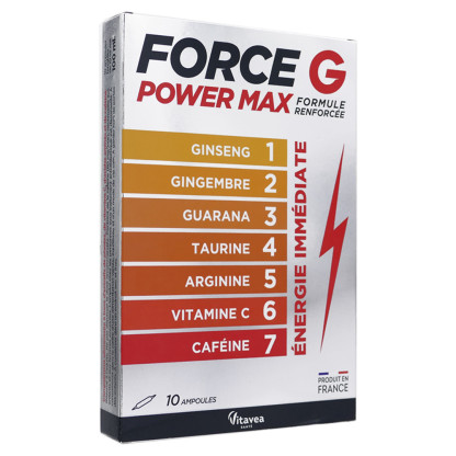 Découvrez les ampoules NUTRISANTE VITAVEA FORCE G POWER MAX, une formule renforcée pour booster votre énergie au quotidien instantanément lors de fatigue passagère.
