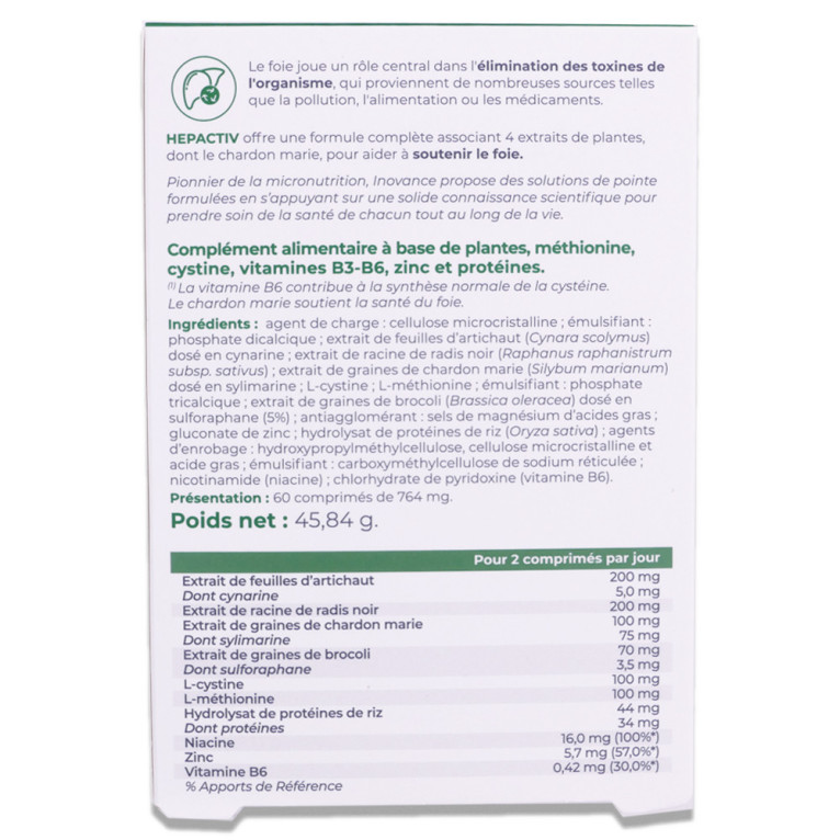 Agent de charge : cellulose microcristalline ; émulsifiant : phosphate dicalcique ; extrait de feuilles d'artichaut (Cynara scolymus) dosé en cynarine ; extrait de racine de radis noir (Raphanus sativus) ; extrait de graines de chardon marie (Silybum marianum) dosé en sylimarine ; L-cystine ; L-méthionine ; émulsifiant : phosphate tricalcique ; extrait de graines de brocoli (Brassica oleracea) dosé en sulforaphane (5 %) ; antiagglomérant : sels de magnésium d'acides gras ; gluconate de zinc ; hydrolysat de protéines de riz (Oryza sativa) ; émulsifiants : carboxyméthylcellulose, cellulose microcristalline et acide gras ; nicotinamide (niacine) ; arôme : huile essentielle de partie aérienne de romarin ; chlorhydrate de pyridoxine (vitamine B6).Pour 2 comprimés par jour : Artichaut : 200 mg, dont cynarine : 5 mg Radis noir : 200 mg Chardon marie : 100 mg, dont sylimarine : 10 mg Brocoli : 100 mg L-cystine : 100 mg L-méthionine : 100 mg Hydrolysat de protéines de riz : 44 mg Vit. B3 : 16 mg (100%*) Zinc : 5 mg (50%*) Vit. B6 : 0.42 mg (30%) *Apports de Référence.