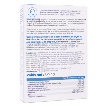 Ingrédients : extrait sec de feuilles de thym (Thymus vulgaris) ; agent de charge : cellulose microcristalline ; bêta-glucanes de levure (Saccharomyces cerevisiae) M-Gard® (dont bêta-1,3 / 1,6-glucanes) ; antiagglomérant : carbonate acide de magnésium ; extrait de racine de échinacée angustifolia (Echinacea angustifolia) titré en échinacosides (4%) ; extrait sec de résine de propolis ; antiagglomérant : sels de magnésium d'acides gras ; acide L-ascorbique (vitamine C) ; agent d'enrobage : hydroxypropylméthylcellulose, cellulose microcristalline et acide gras ; bisglycinate de zinc. M-Gard® est une marque déposée du groupe Lallemand.