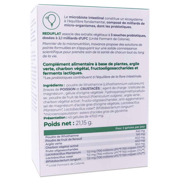 Pour 2 gélules par jour : Fenouil : 100 mg Lithothamne : 340 mg Argile verte : 40 mg Charbon végétal : 40 mg Fructo-oligosaccharides : 30 mg Lactobacillus Plantarum : 7 mg (700 Millions U.F.C**) Lactobacillus Casei : 7 mg (700 Millions U.F.C**) Bifidobacterium Longum : 7 mg (700 Millions U.F.C**). ** Unité Formant Colonie