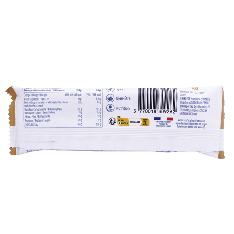 Cette barre qui contient seulement 6 ingrédients, est formulée par le laboratoire HUMBLE + COLLAGEN, spécialisé dans les compléments alimentaires. Composée en collagène français (5g) et en protéines (12g), cette barre est parfaite pour vos articulations avant ou après un effort. Les protéines contribuent au maintien de la masse musculaire et à une ossature normale. Sa composition naturelle et équilibrée en fait un en-cas sain et pratique à emporter partout avec vous.