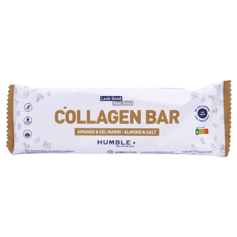 Découvrez la barre énergétique HUMBLE + COLLAGEN à la délicieuse saveur d'amande et une touche de sel marin, idéale pour une pause gourmande et nutritive.