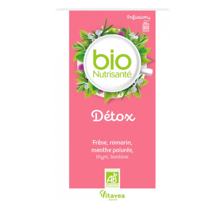 Les infusions bio nutrisanté sont 100% d'origine naturelle et respectent les exigences de l'agriculture biologique. Toutes les plantes qui entrent dans leur composition sont cultivées de manière naturelle avec des méthodes respectueuses de l'environnement et sans utilisation d'organisme génétiquement modifié. Sans arôme artificiel, les infusions conservent toute la pureté des plantes pour un plaisir au naturel. Les sachets-filtres sont fabriqués à base de papier non blanchi au chlore et ne possèdent pas d'agrafe pour éviter tout phénomène d'oxydation.L’ infusion bio Detox Nutrisanté aide à détoxifier l'organisme en facilitant l'élimination de l'excès d'eau par les voies urinaires. Le frêne, reconnu pour favoriser l'élimination rénale de l'eau, facilite ainsi la suppression des toxines du corps. Le Romarin qui aide le foie à accomplir ses fonctions de purification. La Menthe Poivrée qui contribue au bon fonctionnement des intestins. Elle apporte, avec le thym une agréable sensation de fraîcheur à cette infusion. La Bardane favorise un drainage naturel et contribue au maintien d'un teint éclatant.