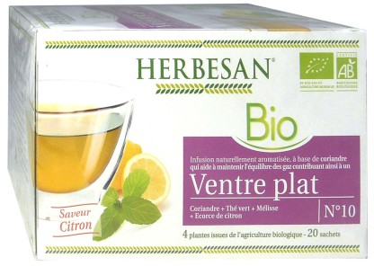 Le laboratoire HERBESAN conçoit des compléments alimentaires et médicaments à base de plantes et nutriments pour assurer le bien-être quotidien (digestion, infusion, vitamines,…). L’infusion Ventre plat à base de 4 plantes bio (coriandre, thé vert, mélisse, citron) va favoriser participer à l’équilibre des gaz, favoriser la digestion, et participer à l’équilibre organoleptique du phytocomplexe. Rapidement, ses bienfaits se ressentent : les inconforts au niveau du ventre disparaissent pour retrouver un ventre plat. Son délicieux goût à la vanille fera de cette infusion un vrai plaisir à boire !