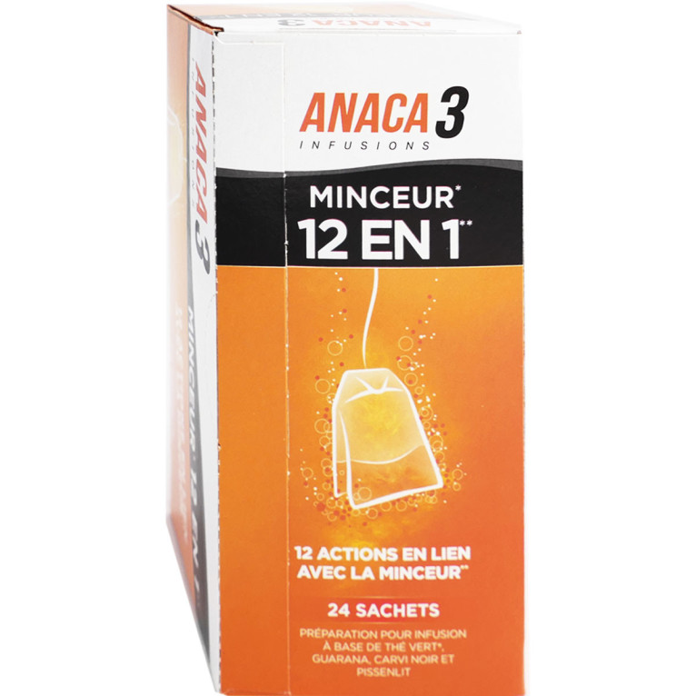 Anaca3 Infusion 12 en 1 est une infusion qui va grâce à 4 plantes (thé vert, guarana, carvi noir, pissenlit) agir sur 12 actions minceurs : elle facilite la digestion, et aide à limiter les inconforts digestifs (comme les ballonnements) grâce à l'action du Carvi noir ; et aide à combattre les excès de poids pour soutenir lors d’amincissement grâce au thé vert. L’infusion contient également du guarana qui contribue à la perte de poids en complément des mesures diététiques ; stimule la dégradation des lipides en contribuant à l’oxydation des graisses, et supporte le métabolisme des lipides.
