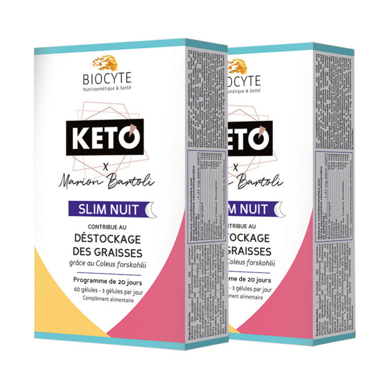 KETO SLIM NUIT discount de BIOCYTE, un complément alimentaire à base de Coleus Forskohlii qui aide à réguler le métabolisme et le déstockage des graisses, de la vitamine B6 qui contribue à un métabolisme énergétique normal ainsi que de la choline qui favorise un métabolisme lipidique normal dans votre parapharmacie en ligne à prix discount.