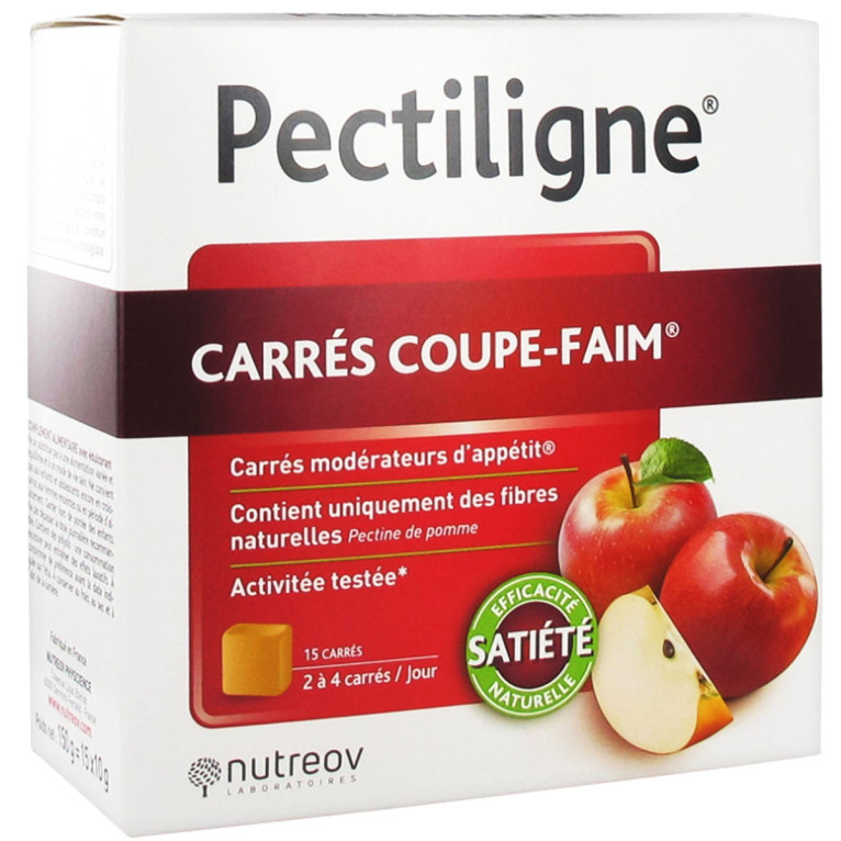 Pectiligne Carrés Coupe-Faim du laboratoire NUTREOV, est un complément alimentaire composé de pectine de pomme, qui une fois dans l’estomac apporte une sensation de satiété.