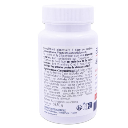 Par comprimé %AJR*/Comprimé :Extraits de Tagetes erecta .. 50mg Dont lutéine libre .. 5mgDonc zéaxanthine .. 0,3mgZéaxanthine synthétique .. 0,7mgVitamine C .. 60mgVitamine E .. 15mgVitamine B2 .. 50 mg
