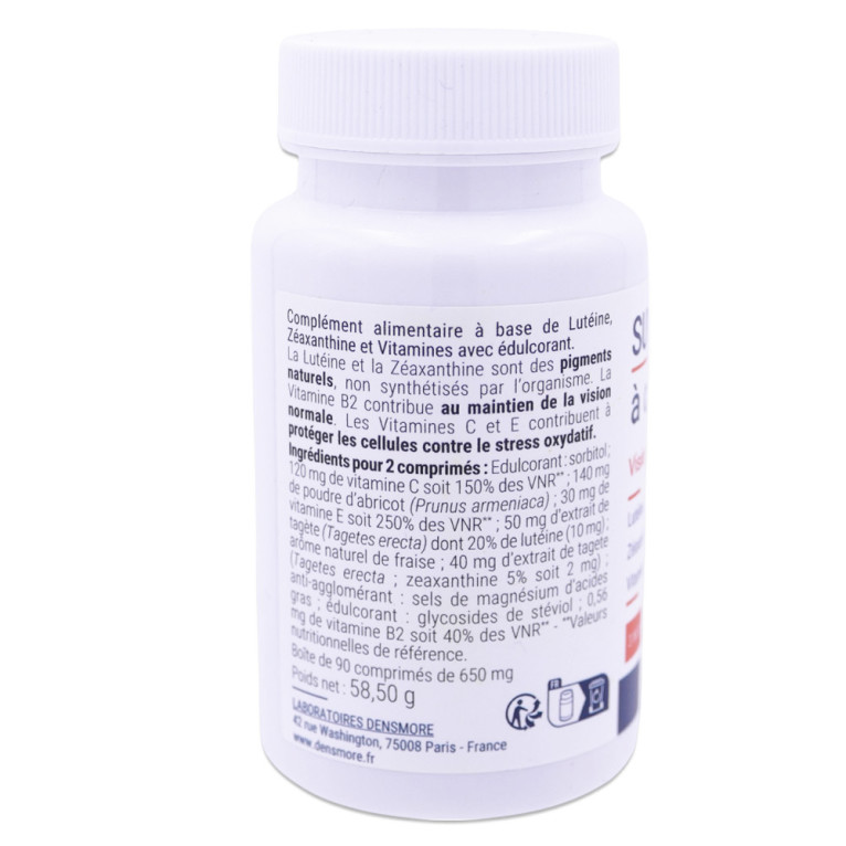 Complément Alimentaire à base de: Edulcorants : xylitol, isomalt, poudre d’abricot, acide ascorbique (Vitamine C), Lutéine (extrait de Tagetes erecta), acétate de d-alpha tocophérol (Vitamine E), Emulsifiant :croscarmellose sodique, Zéaxanthine synthétique, arôme naturel fruit des bois, anti-agglomérant : stéarate de magnésium végétal, édulcorant : sucralose, Riboflavine (Vitamine B2).