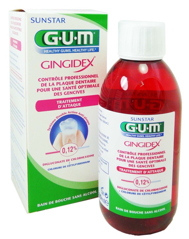 GUM Sunstar, dont le nom évoque le soleil (sun) et les étoiles (stars) puisqu’on se lave les dents au lever du jour et à la tombée de la nuit, développe depuis près d’un siècle des produits de soins buccaux et dentaires révolutionnaires de très grande qualité offrant une réponse adaptée à tous les besoins : brosses à dent, soins inter-dentaires, fils dentaires... La gamme GUM gencives propose des produits spécialement conçus pour maintenir des gencives saines et en bonne santé. Le Bain de bouche GUM Gingidex 0,12% peut s’utiliser en traitement d’attaque pour favoriser l’élimination de la plaque dentaire et apaiser les gencives sensibles. Sa formule associe du Digluconate de Chlorhexidine à 0,12% et du Chlorure de Cétylpyridinium à 0,05% pour réduire l'inflammation des gencives ainsi que les saignements gingivaux et favoriser la réduction de la plaque dentaire.