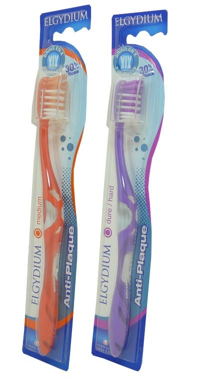 Les brosses à dents ELGYDIUM offrent qualité et innovation grâce à leur conception unique : leur tête est munie de brins dont les extrémités ont été arrondies au disque de diamant pour assurer un brossage non agressif (technologie Tynex®) ; chaque brosse à dents fournit des brins dont la technicité a été étudiée pour répondre à tous les besoins ; chaque brosse est équipée d’un protège-tête pour assurer une hygiène optimale et préserver l’intégrité des brins ; le manche bi-matière au design ergonomique assure une prise en main optimale. La brosse à dents anti-plaque est spécialement conçue pour assurer une meilleure élimination de la plaque dentaire (30% supplémentaire) grâce à ses brins extérieurs croisés implantés en X qui optimisent le brossage.