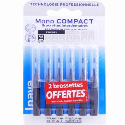 Les brossettes INAVA Mono COMPACT Etroit de 0.6 mm est une brossette inter-dentaire qui vous permets d’accéder aux endroits les plus étroit tout en éliminant efficacement et quotidiennement la plaque dentaire ainsi que les restant alimentaires. Son manche ergonomique possède une surface antidérapante pour vous assurer une meilleure prise en main. Son système innovant vous propose une bi-couleur astucieuse : Le blanc va vous permettre d’identifier les saignements des gencives et le noir vous permettra de contrôler le retrait de la plaque dentaire. Sa tête flexible à 90° vous assure un nettoyage complet. Compact et hygiénique grâce à son capuchon, vous pourrez emporter cette brossette partout.