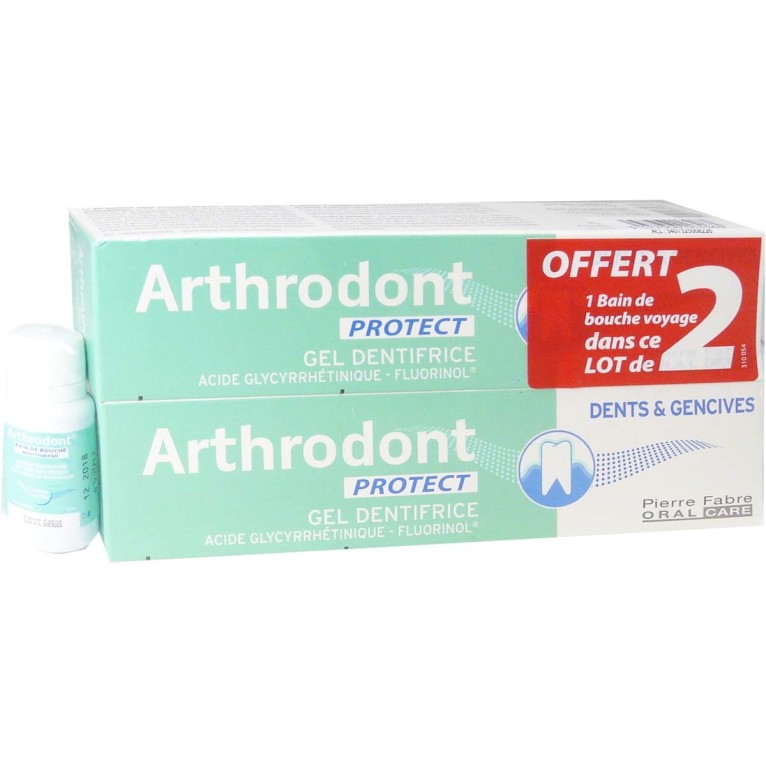 Le lot ARTHRODONT PROTECT est composé de 2 dentifrices et d’un bain de bouche petit format (offert) pour soulager et renforcer les dents et gencives sensibles.
