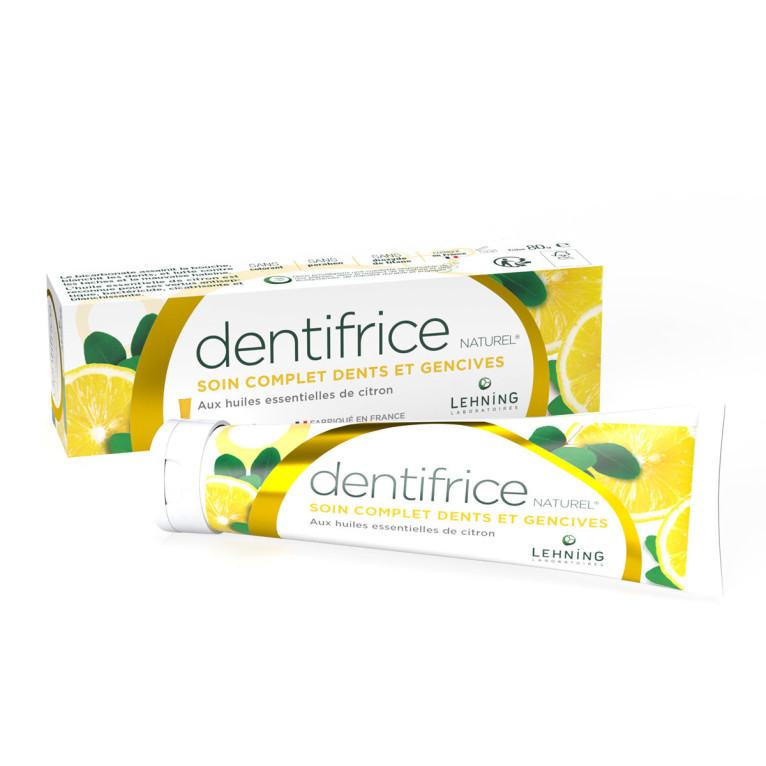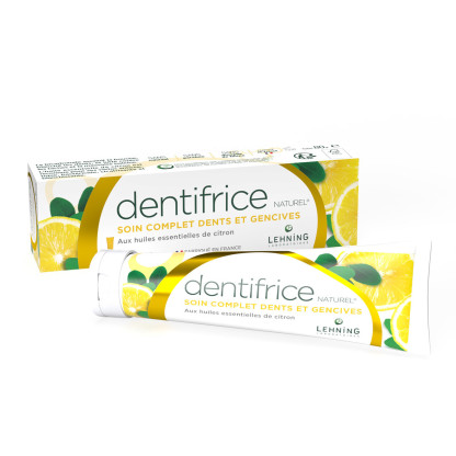 Dentifrice Naturel de LEHNING, la santé au naturel dans un soin complet pour les dents et les gencives aux huiles essentielles de citron.
