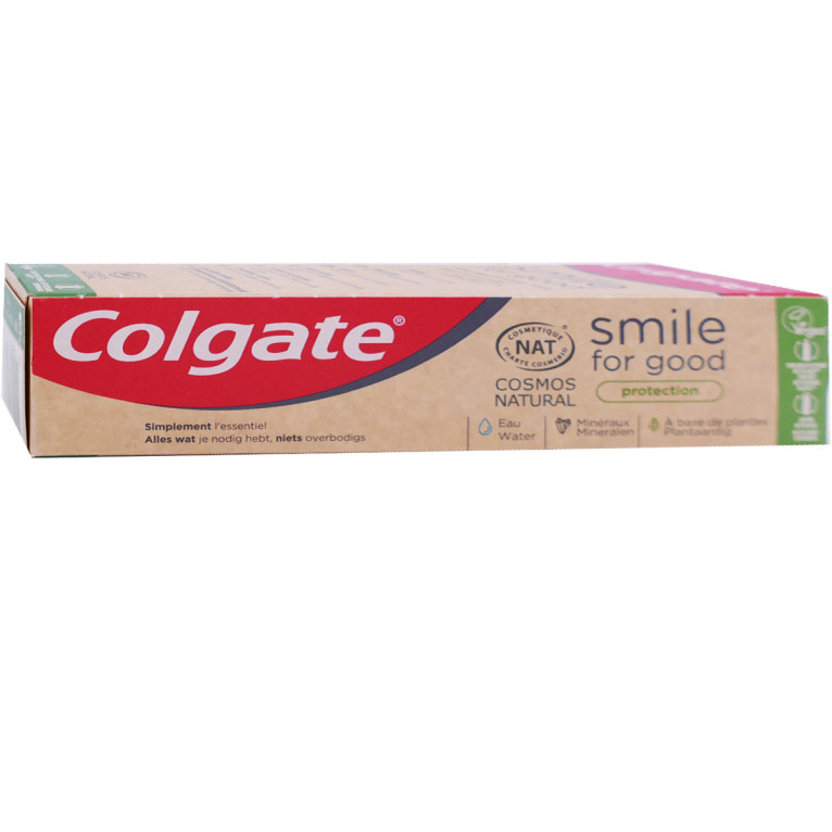 Le laboratoire COLGATE conçoit des produits d’hygiène bucco-dentaire, mais aussi des produits d’hygiène corporels, pour l’entretien de la maison ou encore de la nourriture pour chiens et chats. Le dentifrice SMILE FOR GOOD Protection agit sur la protection des dents et des gencives. Il permet de renforcer les dents pour protéger des caries, et polit pour éliminer la plaque dentaire sur l’émail, grâce à des extraits de plantes, de l’eau et du fluor (1450 ppmF). Les dents sont protégées et propres. Pour prendre soin de la planète, le tube et l’emballage en carton sont recyclable.