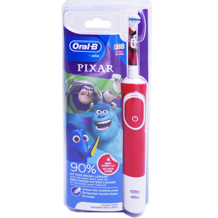 Oral-B est leader sur le marché international de la brosse à dents avec une large offre de produits destinés à l’hygiène bucco-dentaire, si performants que les dentistes eux-mêmes utilisent la marque Oral-B pour leur usage personnel. Oral-B a conçu une brosse à dents électrique spécialement dédiée aux enfants, avec un système de nettoyage en douceur pour un nettoyage en profondeur des dents tout en douceur afin d'éliminer plus de plaque dentaire qu’une brosse à dents manuelle classique. Inclus, quatre autocollants Pixar afin de personnaliser le manche ergonomique de cette brosse à dents qui assure une bonne prise en main, et le minuteur intégré permet un brossage de 2 minutes, durée recommandée par les dentistes pour assurer un nettoyage bucco-dentaire efficace. Une brosse à dents ludique quifonctionne avec l’application Disney Magic Timer d’Oral-B pour que le brossage dentaire devienne un moment de plaisir.