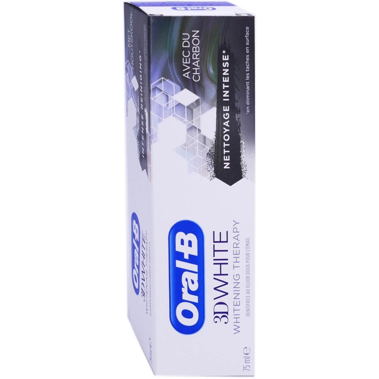 Le dentifrice 3D White nettoyage intense discount d’ORAL B, la confiance de votre sourire, dans votre parapharmacie en ligne, dans un dentifrice au charbon qui nettoie parfaitement les dents pour leur redonner une blancheur éclatante.