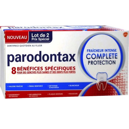 Le Dentifrice Complete Protection de Parodontax à discount lot de 2 tubes permet de rendre le brossage de dents moins douloureux. Grâce à sa composition, il arrête et prévient les saignements et inflammations des gencives tout en vous offrant une haleine fraîche et des dents blanches !