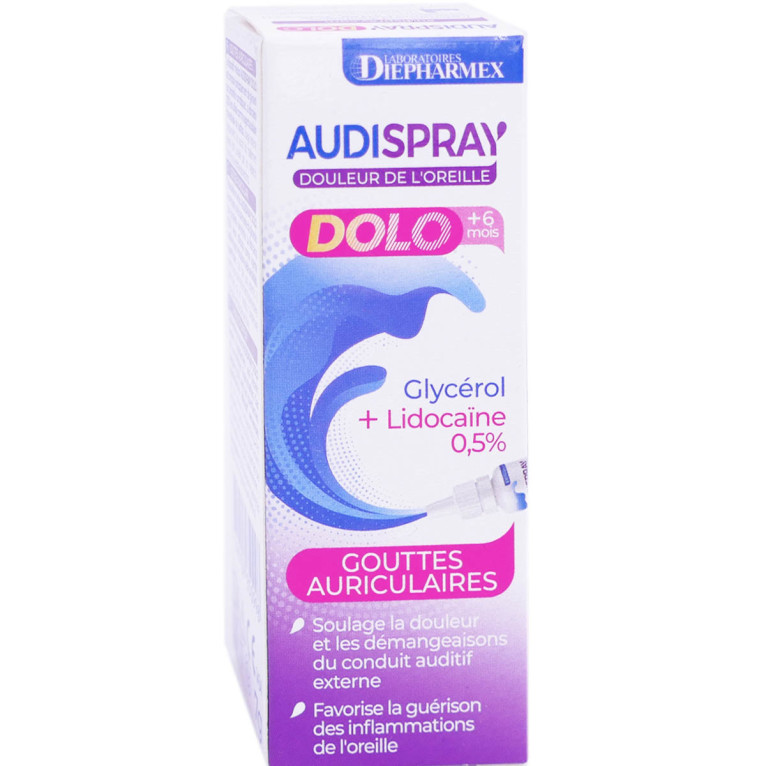 AUDISPRAY Dolo est un dispositif médical à base de glycérol et lidocaïne (0,5%). Ses actifs apaisants et anesthésiants de surface, vont calmer les inconforts de l’oreille en absorbant l’eau qui est retenue dans les tissus gonflés et ainsi soulager rapidement. Sa texture grasse protègera le conduit auditif.